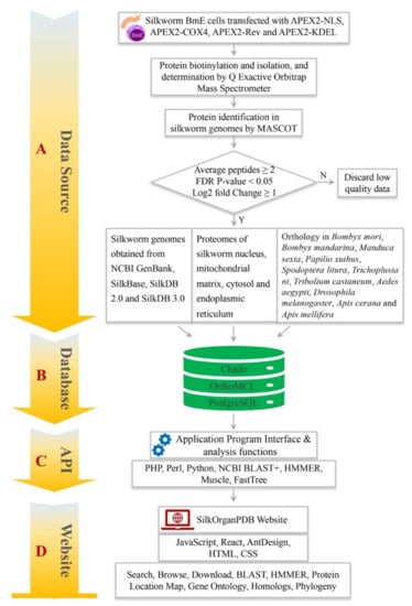 The identified organelle proteins and silkworm genome datasets obtained from GenBank, SilkBase, SilkDB 2.0 and SilkDB 3.0 were parsed and imported into the Chado schema, which is managed by the PostgreSQL (Figure 8A). Homologous proteins among B. mori, B. mandarina, M. sexta, P. xuthus, S. litura, T. ni, T. castaneum, A. aegypti, D. melanogaster, A. cerana and A. mellifera were predicted with the OrthoMCL, and also imported into the database (Figure 8B). Application programming interface (API) and analysis tools were developed using PHP, Perl, and Python to search data in Chado, and execute analysis programs such as NCBI BLAST+, HMMER, and FastTree (Figure 8C). Based on the Chado and API, the SilkOrganPDB website was designed with JavaScript, React, AntDesign, HTML, and CSS. The website provides users an interface to perform browse, text search, homologous sequence search, download, and phylogenetic analysis (Figure 8D).