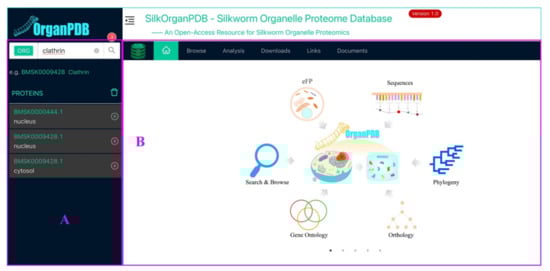 The SilkOrganPDB website (https://silkorgan.biodb.org/, accessed on 30 March 2021) comprises two main panels: the query and functional modules (Figure 9). The query panel provides the user an interface to search organelle proteins by entering keywords and selecting the organelles of an organism, the results of which would be presented right below the input box (Figure 9A). The functional module panel allows the user to browse organism data, download datasets, and analyze data (Figure 9B).