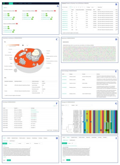 The main functional modules in the SilkOrganPDB. (A) Index organelle proteomes. (B) Browse organelle proteome. (C) eFP. (D) Sequence features. (E) Gene ontology. (F) Protein homologs in insects. (G) Protein phylogeny. (H) BLAST. (I) HMMER.