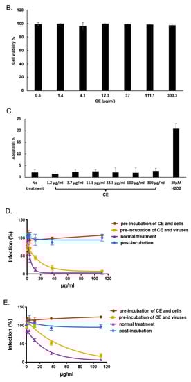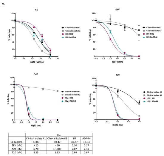 To further characterize at which step of infection CE inhibited HIV-1, multi-dosing time assay experiments were performed with U373-CD4-CXCR4/CCR5 cells against infection of pseudotyped virus pNL4.3ΔEnvLuc-HXB2 and pNL4.3ΔEnvLuc-BAL.Pseudotyped viruses pNL4.3ΔEnvLuc-HXB2/BAL are only able for one cycle of viral infection and allow us to assess the infection level by measuring the luciferase value in the cell supernatant. As shown in Figure 1D,E, the inhibitory effect of CE was apparent when CE was pre-incubated with the virus for 2 h cells (IC50 HXB2 = 2.57 µg/mL, IC50 BAL = 11.41 µg/mL) but not with the cells, as well as when CE was incubated with both cells and viruses during 2 h spinoculation infection (normal treatment) (IC50 HXB2 = 13.37 µg/mL, IC50 BAL = 67.40 µg/mL) but not after infection (CE was added during the first 2 h after the spinoculation). These results indicate that CE inhibits HIV-1 infection at an early stage of the HIV-1 infection independently of co-receptor usage