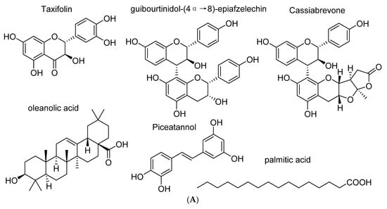 In the past decades, a high number of drugs have been developed from natural products and showed their critical power in medical therapies, such as the anti-malarial drug artemisinin and the anticancer drug paclitaxel []. The 2015 half Nobel Prize award for artemisinin’s discovery recently emphasized the enormous value of traditional medicine and ethnopharmacology. In this regard, Cassia abbreviata (C. abbreviata) is a tropical tree in Cassia genus, Fabaceae family, which is indigenous to South-East Africa, widespread in African countries and commonly used in the African local medicines []. Roots, barks, and leaves are taken as decoction or chewed, for healing abdominal pain, fever, cough, snake bite, malaria, infections, and, in particular, HIV-1 infection [,]. We have recently reported the isolation of 28 compounds from a crude extract of bark and roots of C. abbreviata []. Six bioactive compounds showed anti-HIV activity. Leteane et al. [] has previously reported that a tanning free crude extract of C. abbreviata root inhibited HIV-1c (MJ4) replication in human peripheral blood mononuclear cells (PBMCs). It is known that a variety of compounds, including alkaloids, tannins, anthraquinones, and flavonoids, may contribute to the biological effect of plant medicines [], while the active components of C. abbreviata’s, as well as their mode of action, are still unknown.