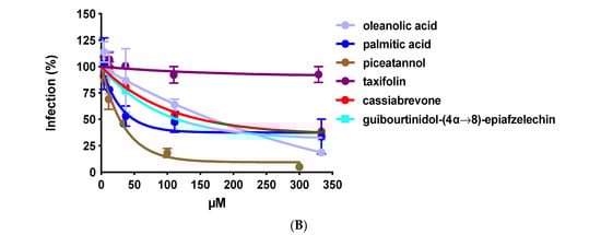 Anti-HIV-1 entry activity of oleanolic acid, palmitic acid, piceatannol, taxifolin, 4′7-dihydroxyflavan-(4,6)-3, 4′, 5,7-tetrahydroxyflavan and cassiabrevone. (A) Chemical structures of the compounds. (B) Oleanolic acid, palmitic acid, piceatannol, taxifolin, guibourtinidol-(4α→8)-epiafzelechin, and cassiabrevone were tested on U373-CD4-CXCR4 cells infected with pseudotype virus pNL4.3ΔEnvLuc-HXB2 when added only at the time of infection. Percentage of infection versus the control cells infected without any compounds is represented.