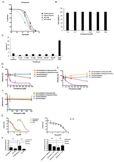 We first confirmed that piceatannol protected PBMCs against HIV-1 IIIB and HIV-1 ADA-M (IC50 = 24.22 ± 7.13 µM and IC50 = 19.91 ± 0.22 µM, respectively), and against two non-B HIV-1 primary clinical isolates harboring multi-drug resistance to NRTI, NNRTI, and PI (IC50 of 37.72 ± 12.54 and 8.04 ± 3.07 µM) (Figure 3A). We also examined the cytotoxicity and apoptosis in the PBMCs treated with piceatannol for 2 days by flow cytometry. As shown in Figure 3B,C, piceatannol was not cytotoxic and did not induce any apoptosis. We next deciphered whether piceatannol targets cells or viruses using the multi-dosing time assay (Figure 3D). In contrast to CE, piceatannol inhibited HIV-1 infection at high concentration when it was pre-incubated with cells but not pre-incubated with the virus, indicating that piceatannol’s action is maximal when added together on both surface of cells and viruses. We did not find any effect of piceatannol when added after the step of infection in our pseudotyped assay although the integrase inhibitor raltegravir inhibited HIV-1 infection when added only after the time of infection.