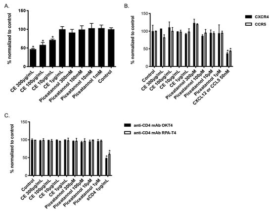 Binding activity of C. abbreviata’s crude extract and piceatannol. (A). CE and piceatannol were tested in an in-house ELISA assay against gp120 binding activity. Data were normalized to control cells without CE/piceatannol treatment. (B) U373-CD4-CXCR4/CCR5 cells were incubated with either anti-CD4 antibody OKT4 or RPA-T4 in the presence of CE and piceatannol. Soluble CD4 (sCD4) was used as a positive control for binding anti-CD4 antibodies. (C) U373-CD4-CXCR4/CCR5 cells were incubated with either anti-CXCR4 antibody 12G5 or anti-CCR5 antibody 2D7 in the presence of CE and piceatannol. The chemokines CXCL12 and CCL5 were used as positive controls for binding CXCR4 and CCR5, respectively. Data were normalized to the MFI of the control cells. Three independent assays were performed for each binding assay, and ANOVA analysis was done for statistical significance. * p < 0.05.
