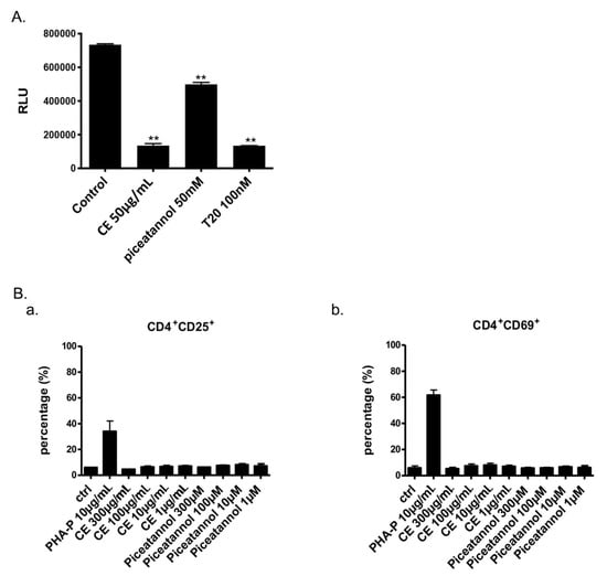 Evaluation of Piceatannol as a microbicide. (A) CE, piceatannol and T20 were tested in a dual chamber system. Compounds and HIV-1 ADA-M viruses were added to Hela cells in the upper chamber. Luciferase of TZM-bl cells in the lower chamber was measured at 24 h post-infection. (B) Expressions of CD25 (a) and CD69 (b) on PBMCs with or without CE and piceatannol treatment were measured by flow cytometry. ANOVA analysis was performed for statistical significance. ** p < 0.01.