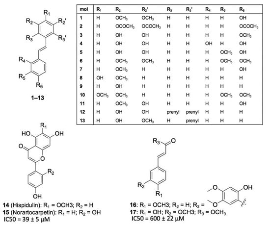 Piceatannol emerged from this study as a promising anti-HIV-1 compounds extracted from C. abbreviata. Since molecular details of piceatannol interaction with its target(s) are currently not available, we performed a structure-activity relationship (SAR) study with the aim to understand the chemical and pharmacophoric features of piceatannol that are relevant for its anti-HIV activity. Seventeen chemical analogues of piceatannol (molecules 1–17, Figure 6) were designed and retrieved from commercial vendors and from an in-house library of natural products and their derivatives [,,,,] and tested in vitro against HIV-1 entry and HIV-1 infection using the pseudotype and the MTT assay, respectively. Compounds 1–13 are stilbene derivatives endowed with subtle chemical modifications with respect to piceatannol (i.e., molecules 4 and 5) or bearing larger substituents (i.e., 6–11 and longistilines 12 and 13) showing no anti-HIV activity. Besides, the two flavones hispidulin 14 and norartocarpetin 15, and the two styrene derivatives 16 and methyl ferulate 17 were tested. Only compounds that do not bear the stilbene scaffold showed some activity: methyl ferulate 17 at high concentrations (IC50 = 600 ± 22 μM) and norartocarpetin 15 (IC50 = 39 ±5 μM, CC50 > 500 μM), the latest showing antiretroviral activity similar to piceatannol. Norartocarpetin is structurally related to taxifolin, although it is noticeably more potent. This result clearly indicates that pharmacophoric features of piceatannol are highly specific, and that subtle modifications to its chemical structure determine a significant drop of anti-HIV-1 activity. Accordingly, it is not surprising that stilbene derivatives bearing larger substitutions, such as molecules 1, 2, 6–11, and longistilines 12 and 13 proved inactive, as well. Similar to piceatannol, the comparison between structure and activity of 14 and 15 further highlights the key role of polyphenols in providing anti-HIV activity.