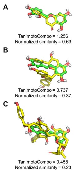 Pharmacophoric studies. (A) ROCS alignment between the query built on piceatannol and norartocarpetin, 4′7-Dihydroxyflavan (4,6)-3, 4´, 5,7- tetrahydroxyflavan (B), and cassiabrevone (C). Piceatannol is shown as green balls and sticks with the same orientation in the three panels. Aligned ligands are shown as yellow sticks. Non-polar H atoms were omitted. The TanimotoCombo and normalized similarity scores are reported for each pair of compounds.