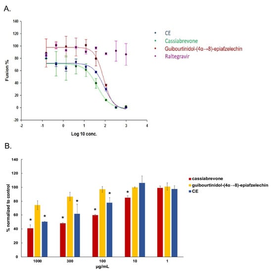 Cassiabrevone inhibits gp120/CD4 interaction. (A) Hela-P4-CXCR4 cells pretreated with CE, guibourtinidol-(4α→8)-epiafzelechin), and cassiabrevone were incubated with hela-ENV-Lai cells. β-Galactosidase activity was accessed. Data were normalized to control cells without any drugs to give the percentage of fusion. (B) Cassiabrevone and guibourtinidol-(4α→8)- -epiafzelechin were tested in an in-house ELISA assay against gp120 binding activity. Data were normalized to control cells without compound treatment. ANOVA analysis was performed for statistical significance. * p < 0.05.