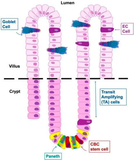 Schematic representation of the differentiation and functional anatomy of the crypt-villus unit. EC: enterochromaffin cell; CBC: rapidly cycling crypt base columnar cells; TA: proliferative transit-amplifying zone. Modified from Li et al., 2011 [10].