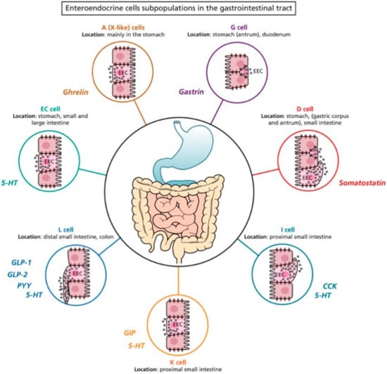 Normally, EECs are distinguished by secretion products: ECs (serotonin, melatonin, substance P, and, in minor amount, secretin, gamma-aminobutyric acid, guanylin and sometimes cortico-releasing hormone); I cells (cholecystokinin), X cells (ghrelin), L cells (glucagon-like peptide), D cells (somatostatin), K cells gastric inhibitory peptide), I cells (cholecystokinin), and N cells (neurotensin) [20,21,22].