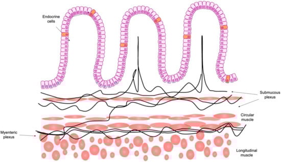 The intestinal epithelium is one of the largest exposed surfaces of the human body and is a very important interface for integrating microenvironmental information with physiological signals from the immune, cardiovascular, and nervous systems [1,2,3]. It is generally associated with dietary nutrients; inflammatory agents and microbiota products modulate many biochemical pathways such as digestion, metabolism, pain, and immunity [2,4,5]. In the human gut, there are around 100 million intestinal endocrine cells, defined as enteroendocrine cells (EECs), found from the stomach to the rectum [5,6]. These cells are scattered, for example, along the epithelial cells in the crypts and villi of intestinal organs and represent 1% of the total gut epithelium [7,8].