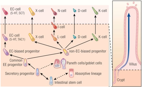 In the year 1960, EECs were found to have markers for neuronal differentiation, and, for this reason, they were believed to originate from the neural crest and were named neuroendocrine cells [9]. Then, new technical approaches showed that EECs are derived from the endoderm and not the neuroectoderm, even if they share features with neurons [5,10]. They arise from pluripotent stem cells at the base of the gut crypts and migrate up the crypt–villus axis; stem cells differentiate into EECs over a period of 2–6 days thanks to three basic helix–loop–helix transcription factors as reported by Li et al., (2011) and Latorre et al., (2016). The same stem cells give rise to other epithelial cell types of the gut (enterocytes, Paneth, goblet cells), and these cells are present in the villi and crypts of the gut as shown in Figure 1. They are shed by an apoptotic process into the intestinal lumen at the end of their lifespan [3,10].