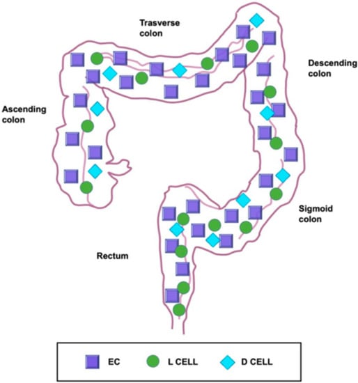 Schematic representation of the different distribution of enteroendocrine cell subtypes. They are the most abundant enteroendocrine cell subtype of the colon and rectum. D cells are scattered evenly throughout the GI tract, even if they are uncommon. The frequency of L-cells, instead, increases from proximal to distal being most concentrated in the rectum. EC: enterochromaffin cell. Modified from Gunawardene et al., 2011 [23].