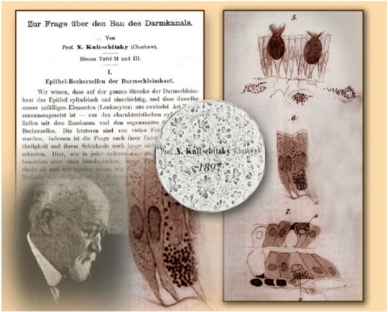 First description of a «unique» cell of the intestinal epithelium (right), made by Nikolai Kulchitsky (bottom left) in 1897. His work Zur Frage über den Bau des Darmkanals was published in Arch Mikr Anat 1897. The Figure is obtained from Drozdov et al., (2008). Reprinted by permission from Springer Nature Customer Service Centre GmbH: Springer Nature, Cell and Tissue Research (License Number 5232431160386, 19 January 2022) [24].
