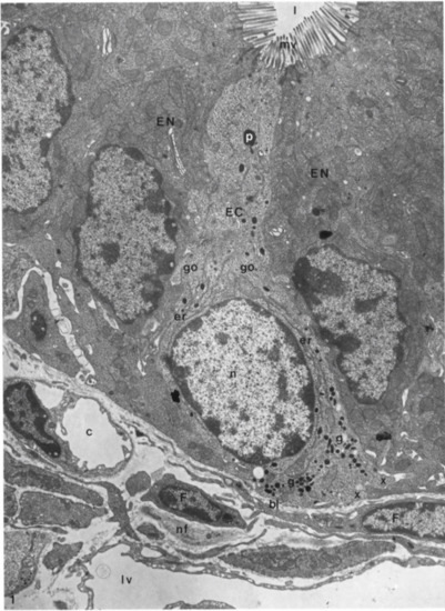 Longitudinal section of an enterochromaffin cell from the basal lamina to the lumen of a duodenal crypt, in which it is possible to recognize a fenestrated capillary, fibroblast, lymph vessel, and nerve fibers. Moreover, it is also possible to highlight the presence of rough endoplasmic reticulum, secretory granules, Golgi complexes, microvilli, phagosome, and basal cytoplasmic extensions of the enterochromaffin cell. EC: enterochromaffin cell; bl: basal lamina; l: lumen; c: capillary; nf: nerve fibers; lv: lymph vessel; F: fibroblasts; EN: enterocytes granules; g: secretory granules; go: Golgi complexes; mv: microvilli; p: phagosome; x: basal cytoplasmic extension. X 9.600. The Figure is obtained from Wade et al., (1985). Reprinted by permission from Springer Nature Customer Service Centre GmbH: Springer Nature, Cell and Tissue Research (License Number 5232430326152, 19 January 2022) [33].