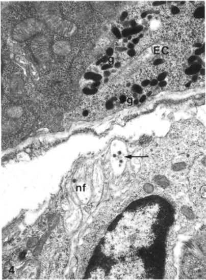 Base of an enterochromaffin cell fixed in glutaraldehyde and osmium tetroxide in which it is possible to see the presence of secretory granules containing clear and dense-cored vesicles, close to nonmyelinated nerve fibers. EC: enterochromaffin cell; nf: nonmyelinated nerve fibers; g: secretory granules; black arrows indicate dense-cored vesicles. X25.500. The Figure is obtained from Wade and Westfall, (1985). Reprinted by permission from Springer Nature Customer Service Centre GmbH: Springer Nature, Cell and Tissue Research (License Number 5232430326152, 19 January 2022) [33].