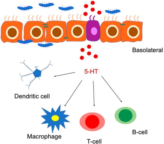 Of particular interest, the three receptors for 5-HT are expressed in several immune cells of humans and rodents [75,76]. It is known that the recruitment of immune cells (i.e., dendritic cells, eosinophils, and mast cells) in the inflammation site is stressed by 5-HT during acute inflammation (Figure 11).