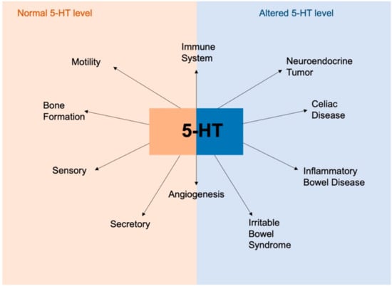 Overview of the involvement of 5-HT in physiological and pathophysiological conditions. 5-HT plays an important role in gut physiology and in maintaining intestinal homeostasis. 5-HT is also important in the regulation of immune response and angiogenesis. Alteration in 5-HT production resulting in dysregulation of 5-HT signaling is associated with various disorders like inflammatory bowel diseases, celiac disease and neuroendocrine disorders. 5-HT: 5-hydroxytryptamine. Modified from Banskota et al., 2019 [76].