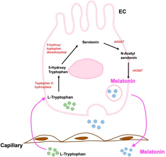 Schematic description of the biosynthetic pathway of melatonin in enterochromaffin cells of mammals. ANAAT: arylalkylamine-N-acetyl transferase; HIOMT: hydroxindole-O-methyltransferase; EC: enterochromaffin cell; black arrows indicate the reactions. Modified from Pal et al., 2019 [78].