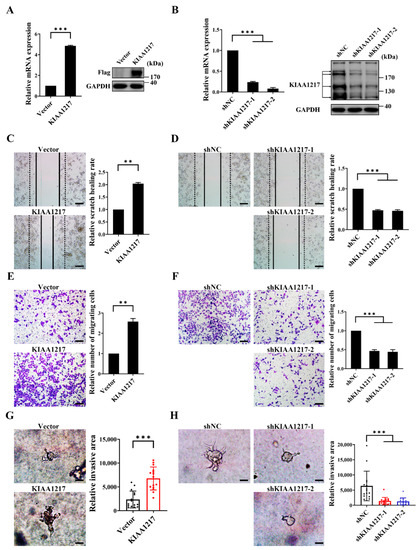 KIAA1217 promoted cell migration and invasion in vitro. (A,B) The overexpression (A) or silencing (B) of KIAA1217 in HepG2 cells were confirmed using RT–qPCR and Western blot analyses. β-Actin and GAPDH were used as internal controls for RT–qPCR and Western blot, respectively. (C,D) Wound-healing assays were performed to detect the migration of HepG2 cells with KIAA1217 overexpression (C) or knockdown (D) at 48 h after scratching. Magnification ×100; scale bars: 100 μm. (E,F) Transwell migration assays were performed to detect the migration of HepG2 cells with KIAA1217 overexpression (E) or silencing (F). Magnification ×100; scale bars: 100 μm. (G,H) Cancer cell spheroid invasion assays in a 3D setting were performed to detect the invasion of HepG2 cells with KIAA1217 overexpression (G) or knockdown (H). Magnification ×200; scale bars: 5 μm. ** p < 0.01; *** p < 0.001. Error bars: SEM.