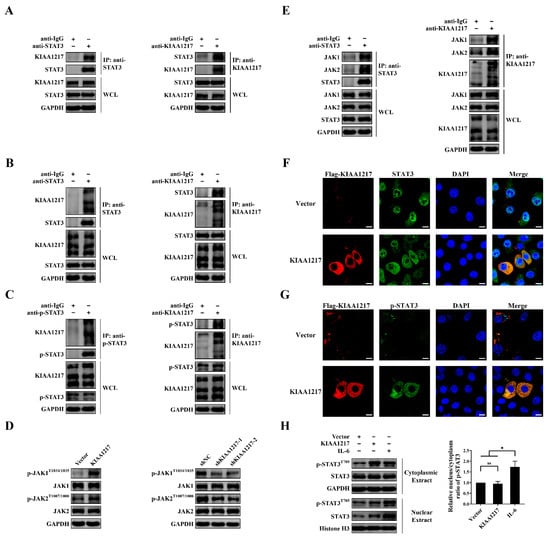 The interaction of KIAA1217 with STAT3/p-STAT3 and JAK1/2 in HCC cells. (A–C) Co-IP analysis of KIAA1217 and STAT3/p-STAT3 in HEK-293T cells ectopically expressing KIAA1217 and STAT3 (A) or in HepG2 cells (B,C). Isotype-matched IgG was used as a negative control. (D) Western blot analysis of the levels of JAK1/2 and p-JAK1/2 in HepG2 cells with KIAA1217 overexpression or knockdown. (E) Co-IP analysis of JAK1/2 with KIAA1217 or STAT3 in HepG2 cells. Isotype-matched IgG was used as a negative control. (F,G) Representative images of double IF staining for KIAA1217 (red) and STAT3 (F)/p-STAT3 (G) (green) captured with a laser scanning confocal microscope. The nucleus was stained with DAPI (blue). The assay was performed in HepG2 cells overexpressing KIAA1217. Magnification ×1000; scale bars: 10 μm. (H) Left panel, The cytoplasmic or nucleic STAT3/p-STAT3 levels in HepG2 cells overexpressing KIAA1217 or treated with IL-6 were detected using Western blot; right panel, quantitative evaluation of the Western blot results. ns: not significant; * p < 0.05. Error bars: SEM. GAPDH and Histone H3 were used as loading controls.