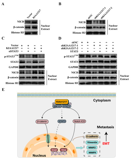 In addition to the STAT3 pathway, we also tested the effects of KIAA1217 on other EMT-related pathways, such as the Notch and Wnt/β-catenin pathways. The Notch and Wnt/β-catenin pathways are well-known classical pathways that induce EMT. As shown in Figure 8A, KIAA1217 overexpression in HepG2 cells increased the levels of the Notch intracellular domain (NICD) and β-catenin in the nucleus, which indicated the activation of the Notch and Wnt/β-catenin pathways, respectively. Consistent with these findings, KIAA1217 knockdown decreased the levels of nuclear NICD and β-catenin in HepG2 cells (Figure 8B). Based on these results, KIAA1217 also mediated the activation of the Notch and Wnt/β-catenin pathways. Then, we speculated whether the Notch and Wnt/β-catenin pathways act downstream of cytoplasmic p-STAT3 activated by KIAA1217. Thus, we tested the effects of STAT3 activation or knockdown on nuclear NICD and β-catenin levels in HepG2 cells with KIAA1217 silencing or overexpression, respectively. Western blot analyses showed that STAT3 knockdown abolished the increase in nuclear NICD and β-catenin levels induced by KIAA1217 overexpression in HepG2 cells (Figure 8C). Conversely, the overexpression of constitutively active STAT3 restored the levels of nuclear NICD and β-catenin that were decreased due to KIAA1217 knockdown in HepG2 cells (Figure 8D). These data suggest that KIAA1217 activates STAT3 and maintains p-STAT3 in the cytoplasm, and then cytoplasmic p-STAT3 subsequently activates the Notch and Wnt/β-catenin pathways, which mediate the effects of KIAA1217 on promoting EMT and invasion and migration of HCC cells (Figure 8E).