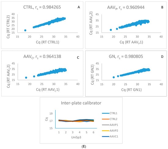 Quality control of the results of analysed sample pools. (A–D). Correlation of expressions of miRNAs between two pools of the same group of samples: (A) correlation between two pools of healthy controls (CTRL); (B,C) correlation between four pools of ANCA-associated vasculitis (AAV); (D) correlation between two pools of glomerulonephrites (GN); (E) Expression of inter-plate calibrators in analysed pools of samples. Six inter-plate calibrators were located on two miRNOME panels (miRNOME panel I in miRNOME panel II).