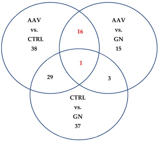 Venn diagram of the number of statistically significant differentially expressed miRNAs. Legend: AAV, ANCA-associated vasculitis; CTRL, subjects without clinical presentation of renal disease; GN, patients with glomerulonephrites other than AAV.