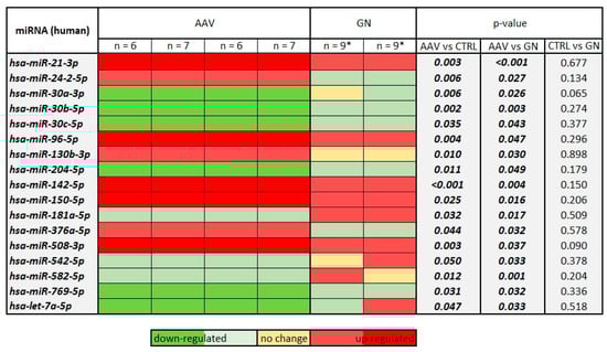 Expression heat map of 17 AAV-specific miRNAs in AAV and GN in comparison to controls without the clinical presentation of renal disease. Legend: AAV, ANCA-associated vasculitis; GN, patients with glomerulonephrites other than AAV; n, number of samples included in the pool; *, two samples were included in both pools of GN samples.