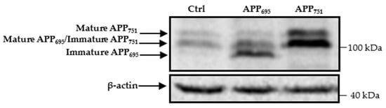 Human embryonic kidney 293 (HEK293) cells produce endogenous forms of APP695, APP751, and APP770, as was previously described in [12]. The immature form of APP695 is poorly detected by Western blotting, whereas it is clearly visible in lysates of cells with overproduction of this protein (Figure 1). The endogenous immature form of APP751, together with mature APP695 and the mature form of APP751 are expressed at relatively high levels (Figure 1). Nevertheless, these levels are significantly higher in the APP751-transfected cells than in the cells transfected with control cDNA (Figure 1).