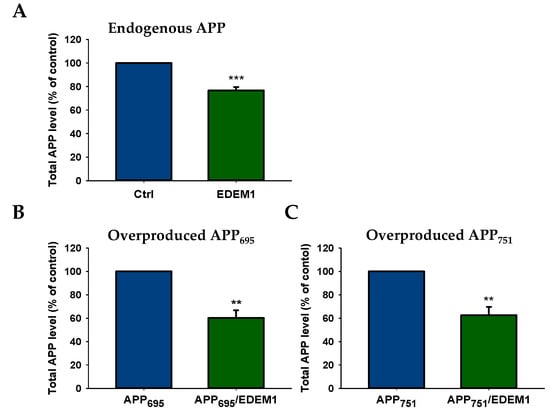 To verify whether the intracellular levels of both the endogenous and overproduced forms of APP could be regulated by high EDEM1 production, we examined the levels of APP695 and APP751 in HEK293 cells by ELISA. For this purpose, cells were transfected with EDEM1 cDNA or cotransfected with APP695 and EDEM1 or APP751 and EDEM1 expression vectors (for transfection conditions, see Section 4). The ELISA analysis of total APP in EDEM1-transfected cells shows a decrease in endogenously produced protein by approximately 25%, relative to control cells (Figure 2A), and an approximately 40% decrease in cells overproducing APP695 or APP751 (Figure 2B,C). It should be noted that in cells with overproduction of APP695 (Figure 2B) or APP751 (Figure 2C), total amount of all APP isoforms was analyzed.