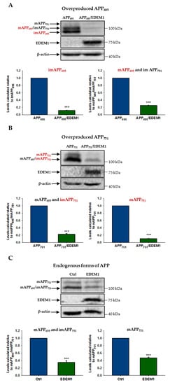 The level of various APP isoforms is reduced in HEK293 cells overexpressing EDEM1. Western blotting of APP, EDEM1 and actin in lysates of cells transfected with (A) APP695, (B) APP751, or (C) control cDNA with or without EDEM1 cotransfection (as indicated). Overexpressed, dominant forms present in (A,B) are indicated in red. Mature APP is abbreviated as mAPP, and immature APP as imAPP. Representative experiments are shown. Molecular mass markers are shown on the right side of the membranes. The levels of APP isoforms were quantified and are shown in the graphs. Values obtained for lysates of cells without EDEM1 overexpression are indicated as 1. Values representing EDEM1-transfected cells are plotted relative to 1. The values are expressed as mean ± SD, n ≥ 3, *** p ˂ 0.001, Student’s t test.