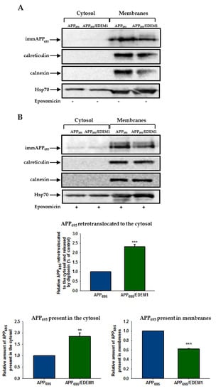 APP695 retrotranslocation from the ER to the cytosol is dependent on EDEM1. Retrotranslocation assay of APP695 in APP695-transfected cells or cells cotransfected with APP695 and EDEM1. Immature APP is abbreviated as imAPP. Cells were either (A) not treated with epoxomicin, or (B) treated with epoxomicin (1 µg/mL) for 5 h before the permeabilisation procedure was applied. Representative examples of Western blotting of APP695, calnexin, calreticulin, and Hsp70 present in the cytosolic and membrane fractions are shown. The graphs show the relative amounts of APP695 retrotranslocated to the cytosol, present in the cytosol, or present in the membranes in cells treated with epoxomicin. Values obtained for lysates of cells without EDEM1 overexpression are indicated as 1. Values representing EDEM1-transfected cells are plotted relative to 1. The values are expressed as mean ± SD, n = 3, ** p ˂ 0.01,*** p ˂ 0.001, Student’s t test.