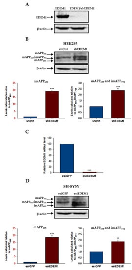 To analyze the relationship between EDEM1 and APP in more detail, we first examined the levels of endogenous forms of APP in HEK293 cells with reduced intracellular amounts of EDEM1. For this purpose, cells were treated with a heterogeneous mixture of siRNA, esiRNA specific for EDEM1 (esiEDEM1), or a control unspecific esiRNA (silencing GFP, esiGFP). Alternatively, cells were transfected with short hairpin RNA, shRNA against EDEM1 (shEDEM1) [59]. Our previous experiments showed that both esiEDEM1 and shEDEM1 effectively downregulate the expression of EDEM1 [59,60]. Additionally, in each experiment, EDEM1 mRNA levels were quantified by qRT-PCR and were estimated relative to GAPDH mRNA, or protein levels were analyzed by Western blotting (Figure 7A). All analyzed data come from experiments in which highly efficient downregulation (90–95%) of EDEM1 was achieved. A reduced level of EDEM1 causes a significant elevation in intracellular levels of APP, both in the immature and mature forms (Figure 7B). Interestingly, the level of the endogenous immature form of APP695 increased approximately 20-fold in cells with downregulated EDEM1, reflecting the levels obtained in cells with overproduction of APP695 (compare with Figure 1).