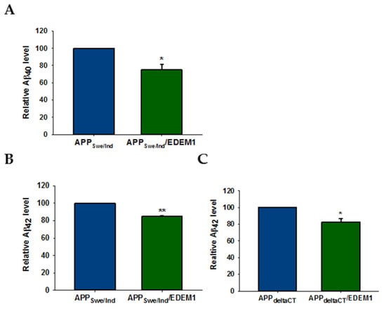 We next investigated the effect of EDEM1 overexpression on Aβ40 and Aβ42 secretion in HEK293 cells cotransfected with APPSwe/Ind and EDEM1 or APPdeltaCT and EDEM1. The Swedish mutation of the APP protein (APPSwe) is known to enhance the abnormal cleavage of cellular APP by β-secretase, resulting in an increase in the total Aβ production and secretion, specifically of the Aβ40 and Aβ42 forms [67,68]. On the other hand, the APP Indiana mutation (APPInd) increases the Aβ42/Aβ40 ratio in conditioned media [69,70]. Finally, in cells transfected with an APP construct with a deletion of the C-terminal intracellular domain of APP (APPdeltaCT) [71], the detected Aβ is entirely derived from the secretory pathway. Since the intracellular domain of APP is necessary for proper endocytosis of APP, production of Aβ that comes from the endocytic pathway is blocked in cells transfected with APPdeltaCT [72,73].