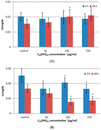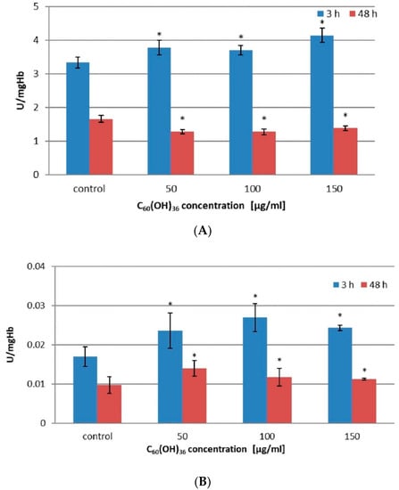 For concentrations above 50–150 µg/mL, C60(OH)36 significantly increased CAT activity after 3 h of incubation compared to control (p < 0.05). After extending the incubation time to 48 h, the activity of CAT in the same concentration range was significantly reduced compared to the samples not treated with C60(OH)36 (p < 0.05) (for details, see Table 2 and Figure 1A).
