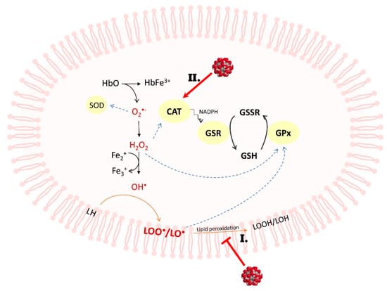 (I) Direct interaction with the membrane and radical scavenging of radicals by C60(OH)36 [17,24,35] and (II) increasing the activity of antioxidant enzymes such as GSR activity, resulting in an increase in the total pool of GSH, which is a cofactor of GPx, which reduced the formation of lipid peroxides. Therefore, the reduction in hemolysis observed in our previous work could be the result of both processes [35].
