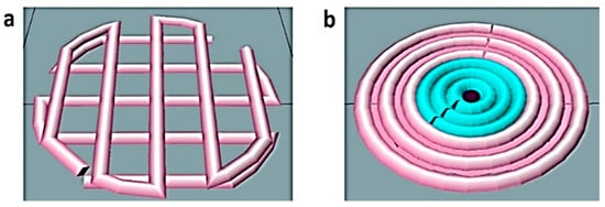 Schematic representation of the 3D printed constructs designed for the present study. For the initial experiments a simple grid-like structure was used (a), while the cancer model (b) consisted of a core of neuroblastoma cells (cyan) surrounded by healthy kidney cells (pink).