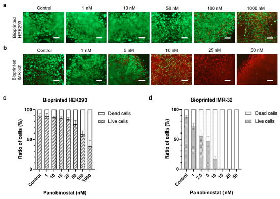 Cytotoxicity of HEK293 cells and IMR-32 cells in printed constructs after treatment with panobinostat. Cytotoxicity assays of 3D-bioprinted HEK293 cells (a) and IMR-32 cells (b) after treatment with panobinostat for 72 h (living cells in green, dead cells in red; all images were taken at the same magnification, scale bar, 250 μm), and the estimated percentages of living and dead cells (c,d).