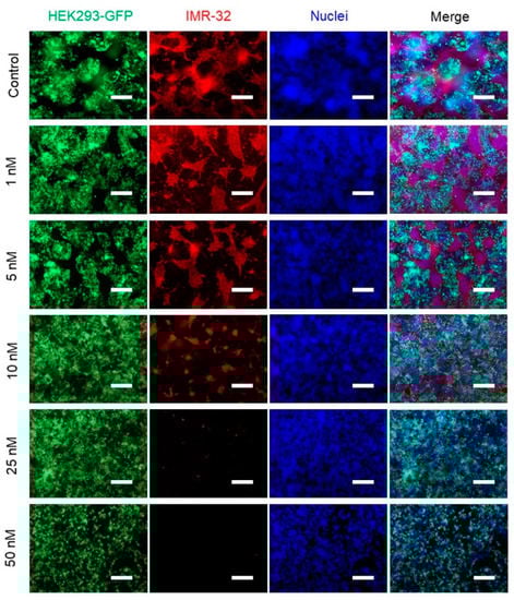 As the study intended to investigate the specificity of treatment for cancerous cells, we also tested whether co-cultivation of both cell types in 2D influences the sensitivity towards panobinostat. To this end, HEK293 cells stably expressing green fluorescence protein (HEK293-GFP) and IMR-32 cells were seeded together at a ratio of 1:1. After treatment with panobinostat, cells were analyzed by an immunofluorescence microscopy (Figure 5). The green fluorescence emitted by HEK293-GFP cells was used to simplify this analysis. IMR-32 cells were labeled by immunofluorescence staining against human disialoganglioside GD2 (GD2, red channel), which is expressed on tumors of neuroectodermal origin, including neuroblastoma and melanoma [38,39]. Nuclear counterstaining was performed with DAPI (4′,6-diamidin-2-phenylindol, blue channel). As shown in Figure 5, HEK293-GFP and IMR-32 cells occupied approximately equivalent areas in the untreated control group after 72 h. With increasing panobinostat doses, the area with red signals, which represents the GD2-stained IMR-32 cells, shrank gradually, whereas green fluorescing HEK293 cells occupied the vacated area. Only at the highest concentration of panobinostat tested (50 nM), was a decrease in HEK293-GFP cells observed, while virtually no more IMR-32 cells were detectable.