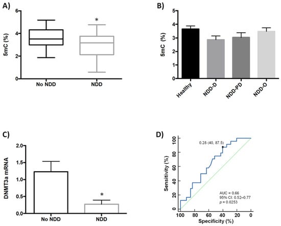 We previously showed that global DNA methylation (5mC) and global DNA hydroxymethylation (5hmC) levels are lower in buffy coat samples from patients with neurodegenerative disorders (AD and PD) and age-related cerebrovascular disease than in healthy patients [35]. Our aim in the present study was to examine whether global DNA methylation was modulated in buffy coat samples from a new, separate, patient cohort (n = 35) that further included individuals with Huntington’s disease and multiple sclerosis, in addition to those with AD, PD and PD-like disorders (Table 1). This study was inclusive and incorporated blood samples obtained from patients previously diagnosed with several types of neurodegenerative diseases (NDDs) and healthy (no-NDDs) subjects; NDD patients included those who exhibited dementia (NDD-D; AD and AD-like disorders such as vascular and mixed dementia), a range of parkinsonisms representing PD and PD-like disorders (NDD-PD), and other NDDs (NDD-O; Huntington’s disease, multiple sclerosis); the no-NDD group comprised 25 patients. Healthy individuals had 5mC levels of 3.58 ± 0.17%, but these values were significantly lower in patients with NDD (3.03 ± 0.19%; p < 0.05) (Figure 1A).