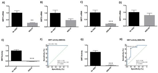 SIRTs are involved in various age-related signaling pathways, including responses to oxidative stress, mitochondrial dysfunction, protein aggregation, and inflammatory processes [37]. SIRT1 and SIRT2 may be protective against pathogenic processes in NDDs [38]. We therefore analyzed SIRT1 and SIRT2 expression in buffy coat samples from healthy subjects and patients with dementia (Table 1). SIRT1 mRNA levels were 75% lower in NDD-D patients than in individuals with no NDDs (p < 0.05) (Figure 2A); there were no significant differences in SIRT2 mRNA levels between these two groups (Figure 2B). To determine whether this reduction was specific to patients with dementia, we analyzed SIRT1 and SIRT2 expression in buffy coat samples from patients with parkinsonism. SIRT1 mRNA expression in NDD-PD patients decreased by 80% (p < 0.001) more than in patients without NDDs (Figure 2C). SIRT2 mRNA levels, however, were 20% lower than in the control group; this reduction was not statistically significant (Figure 2D). To discover whether these deacetylases were also altered in patients with NDD-D (Table 1), we then colorimeterically measured total SIRT enzyme activity in nuclear protein extracts from buffy coat samples. SIRT activity was completely absent in NDD-D patient samples compared to healthy subjects (p < 0.001) (Figure 2E). ROC curve analysis of SIRT activity as a potential biomarker of dementia revealed an AUC of 1.00 (95% CI 0.92–1.00, 100% specificity and 100% sensitivity, p < 0.0001) (Figure 2F). SIRT activity in NDD-PD patients was significantly lower than in subjects with no NDDs (p < 0.001) (Figure 2G). ROC curve data in NDD-PD patients showed an AUC for SIRT of 0.84 (95% CI 0.68–0.94, 81.25% specificity and 85% sensitivity, p < 0.0001) (Figure 2H).