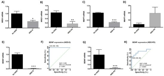 Several genes have been linked to neurodegenerative disease pathogenesis [39,40,41,42,43]. We therefore next examined the expression of neurodegenerative-related genes in buffy coat samples in our patient cohorts (n = 9 healthy subjects; n = 6 NDD-D patients; n = 9 NDD-PD patients) (Table 1). Compared to healthy individuals, transcript levels of the pleiotrophic growth factor neuregulin 1 (NRG1) decreased by 50% in the NDD-D group (p < 0.05) (Figure 3A), and by 80% in NDD-PD patients (p < 0.01) (Figure 3B). Furthermore, mRNA expression of microtubule-associated protein tau (MAPT), associated with increased risk for AD and PD [44,45], was reduced by 65% in NDD-D patients (p < 0.001) (Figure 3C) but was five-fold higher in NDD-PD individuals (Figure 3D) than in subjects with no NDDs. BDNF is important in neuronal maintenance, survival, synaptic plasticity and the regulation of neurotransmission [46,47]. Our data showed a complete loss of BDNF expression in samples from the NDD-D group (p < 0.001) (Figure 3E) compared to healthy control subjects. ROC curve analysis of BDNF expression as a putative biomarker of dementia showed an AUC of 0.95 (95% CI 0.78–0.99, 100% specificity and 100% sensitivity, p < 0.0001) (Figure 3F). This reduction was profound, prompting us to examine BDNF expression in buffy coat samples from patients with parkinsonism (n = 5; Table 1). BDNF mRNA levels were 40-fold lower in NDD-PD patients (p < 0.001) (Figure 3G) than in healthy patients. ROC curve data analysis of BDNF expression from NDD-PD patients showed an AUC of 0.86 (95% CI 0.62–0.97, 100% specificity and 60% sensitivity, p < 0.0001) (Figure 3H).