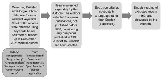 A literature review was conducted. Editorial comments, letters to the editor or indexed abstracts at international congresses were not considered. A comprehensive review was performed by systematically analysing the literature published up to September 2021. The PubMed (https://www.ncbi.nlm.nih.gov/pubmed/, accessed on 30 September 2021) and Google Scholar (https://scholar.google.com/, accessed on 30 September 2021) databases were searched for variations of keywords: ‘kidney’, ‘nanoparticles’, ‘drug delivery’, ‘nanotechnology’, ‘transplantation’, ‘nanomedicine’, ‘renal’, ‘theranostic’, ‘encapsulated’, ‘nanoscale’, ‘nanomaterials’, ‘graft function’, ‘disease’ and ‘application’. We also used PubMed Advanced Search Builder to search for the following phrases: (nanomedicine) AND (imaging OR therapy) AND (application); (((nanoparticles OR nanomaterial*) AND (nanoscale)) AND (properties)) AND (nanomedicine); (nanoparticl*) AND (kidney transplantation) AND (kidney diseas*) and others.