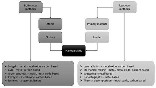 Diagram of nanoparticles synthesis processes and methods and the categories of nanoparticles synthesised from a given method (modified based on Saleh et al. [6]).