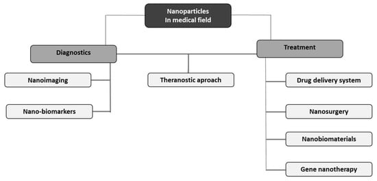 The development of nanotechnology has given hope for new possibilities in medicine. Currently, NMs have various medical applications and are used both to diagnose and treat diseases. With technological advancement and new clinical trials, the indications for using NPs in this field are constantly expanding [26]. Small size, shape, unique mechanical, electrical and optical properties, as well as a large variety of NP formulations allowed for their extensive use in many fields of medical science (Figure 3).