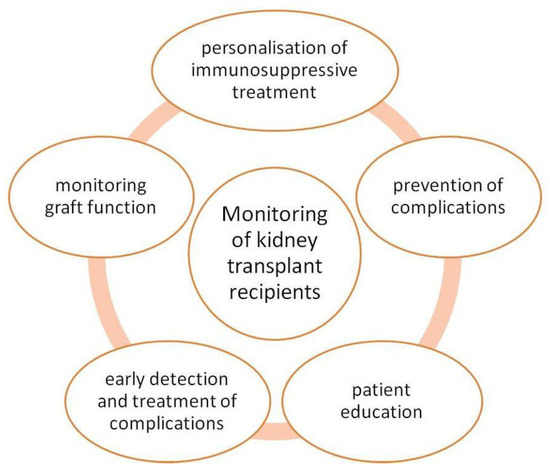 The Kidney Disease: Improving Global Outcomes (KDIGO) Transplant Work Group recommends maintaining immunosuppressive therapy for 8–16 weeks after KTx on the condition of no rejection. The KDIGO 2009 recommendations state that tacrolimus should be the first-choice drug to prevent rejection. It reduces the incidence of AR in the first year after KTx. Calcineurin inhibitors (CI) should be started before or during KTx. If acute cellular rejection occurs corticosteroids are recommended as initial treatment [146,147]. KTx recipients should be monitored after surgery [148]. Figure 4 shows the main aspects of the KTx recipient care.
