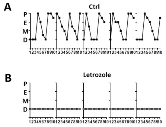 The estrous cycle pattern in the control group (A) and the letrozole-treated mice (B). The control mice showed a normal estrous cycle, whereas the estrous cycle of the letrozole-treated mice was arrested in the diestrus phase. P—proestrus; E—estrus; M—metestrus; D—diestrus.