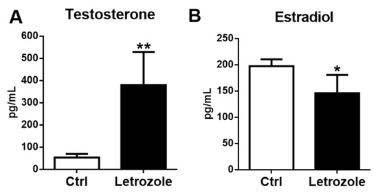 Plasma testosterone levels in the letrozole-treated mice were significantly higher than in the control mice (A), and estradiol levels were significantly lower in the letrozole-treated mice (B). Results are expressed as the mean ± SD. * p < 0.05; ** p < 0.01, compared with the control mice.