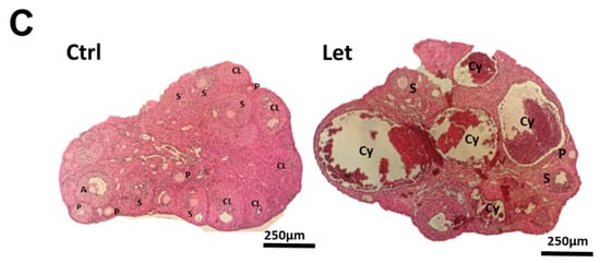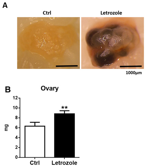 - Ortega, I.; Sokalska, A.; Villanueva, J.A.; Cress, A.B.; Wong, D.H.; Stener-Victorin, E.; Stanley, S.D.; Duleba, A.J. Letrozole increases ovarian growth and Cyp17a1 gene expression in the rat ovary. Fertil. Steril. 2013, 99, 889–896. [Google Scholar] [CrossRef] [PubMed]